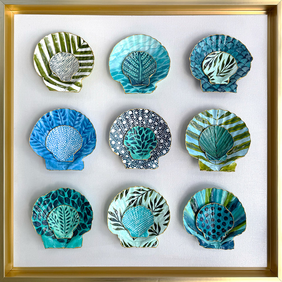 Inspired by the colors, textures, and rhythms of coastal life, each piece in this collection transforms real scallop shells into one-of-a-kind works of art.