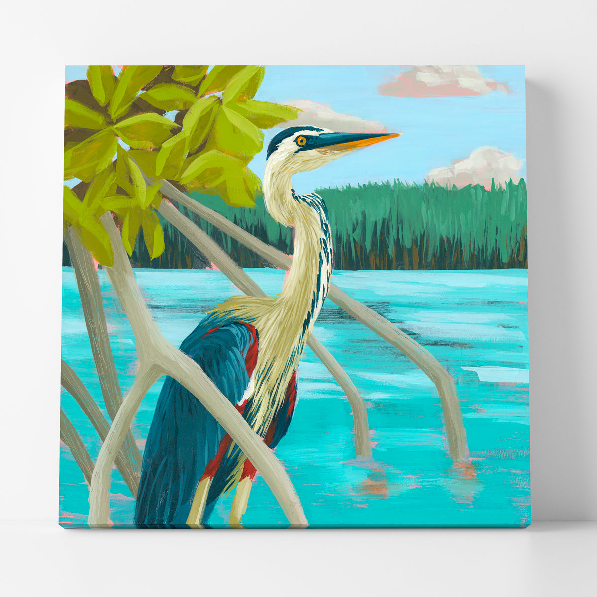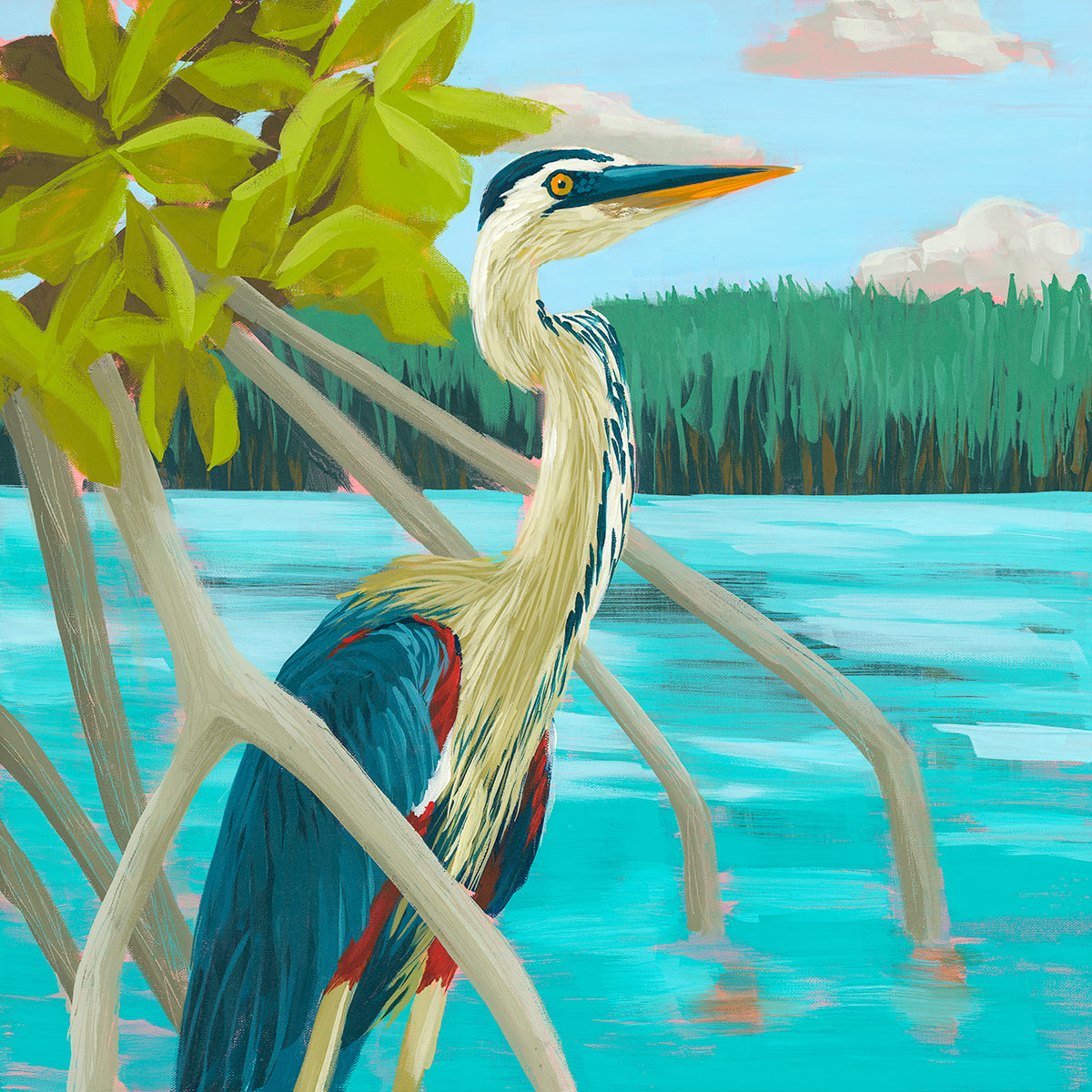 This painting of a Great Blue Heron was inspired by Dora's time as the Featured Artist for Friends of Rookery Bay. It is the original acrylic on gallery wrapped canvas. The back is wired and ready to hang. Front and back are signed by the artist.