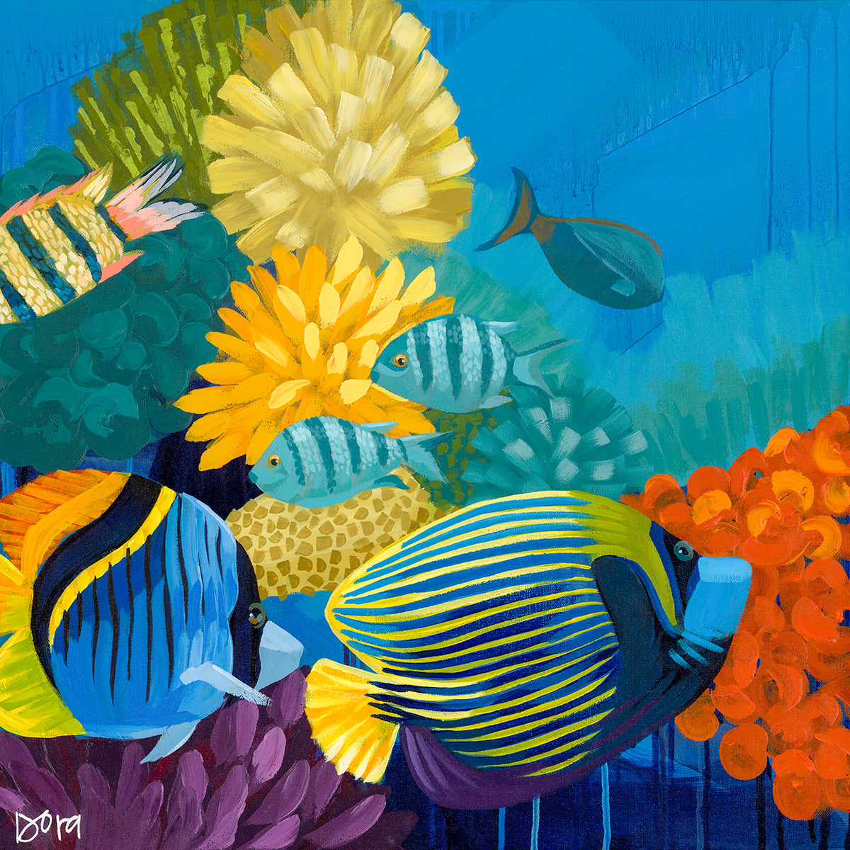 This original coral reef painting is acrylic on gallery wrapped canvas, and the image continues around the edges. Front and back are signed by the artist.